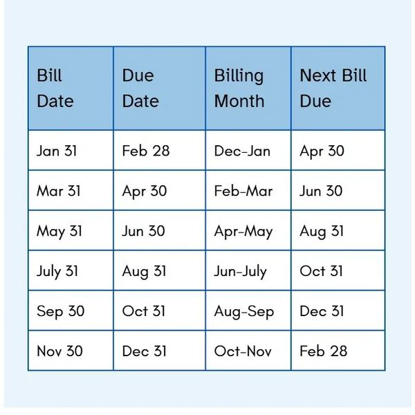 For example, if your bill is for the months of November and December, your bill will be DUE on January 31st.
